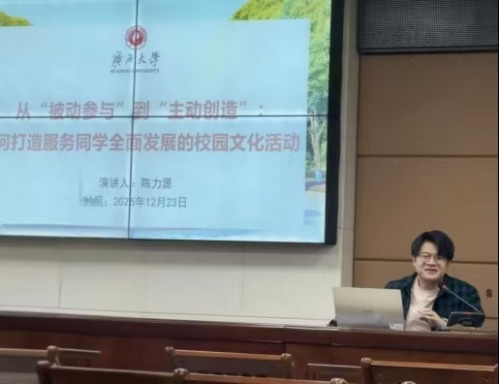 随后,陈力源老师以“从‘被动参与’到‘主动创造’:打造服务同学全面发展的校园文化活动”为题分享经验。他结合自身组织活动的丰富经验,以球盟会研究生会“姻为遇见”研究生交流会为典型案例,阐述了如何通过活动激发员工主动性,实现从“被动接受”到“深度参与”的转变。